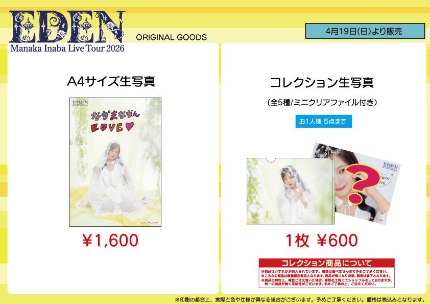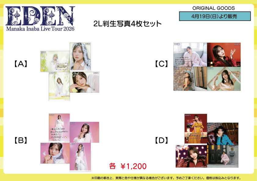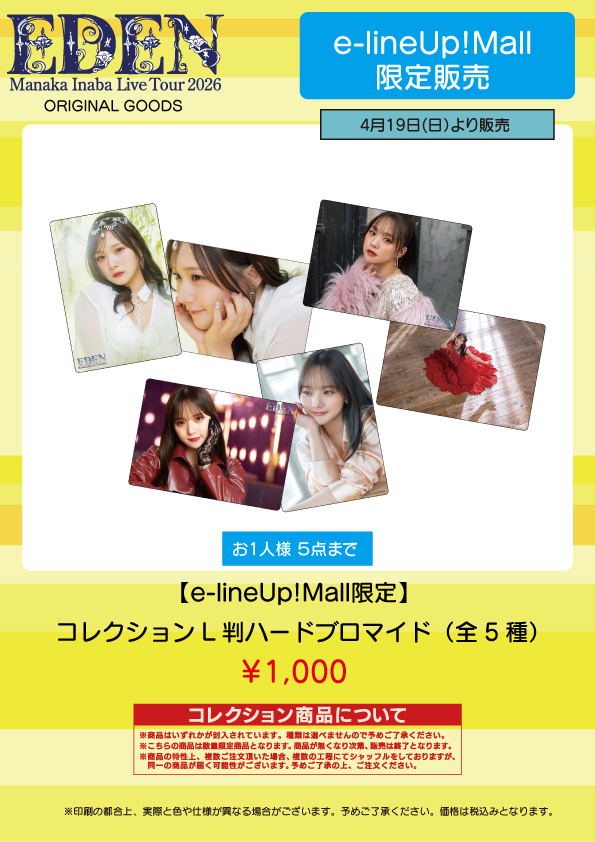 ※e-LineUP!Mallでは「稲場愛香 Live Tour 2026 -EDEN-」ツアー最終公演日から、期間限定で各公演の日付入りソロA5ワイドサイズ生写真の受注販売を予定しております。