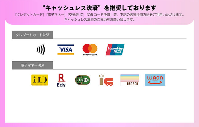 「クレジットカード」「電子マネー」「交通系IC」等、各種決済方法をご利用いただけますので、ご協力をお願いいたします。
