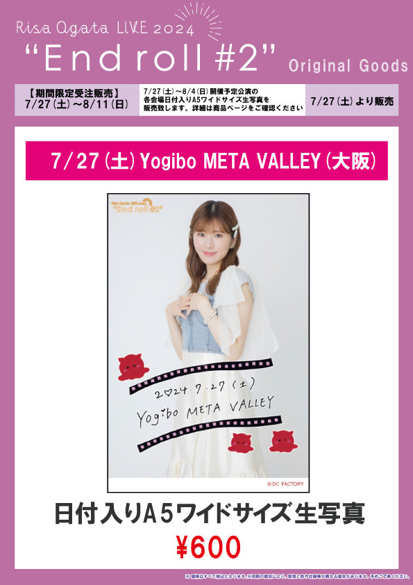 7/27~8/4開催予定の各会場の日付入りソロA5ワイドサイズ生写真を販売いたします。