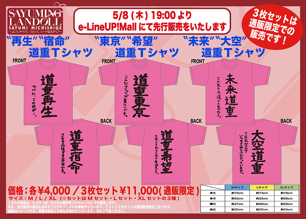 これまでのSAYUMINGLANDOLL『再生』『宿命』『東京』『希望』『未来』『大空』の各公演で販売した『道重四文字』グッズの直筆文字をTシャツの前面・背面にプリントしました!