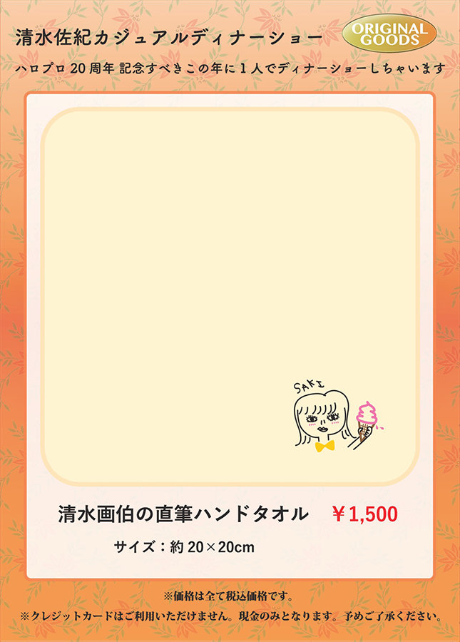 「清水佐紀カジュアルディナーショー ハロプロ20周年 記念すべきこの年に1人でディナーショーしちゃいます」オリジナルグッズ販売のお知らせ